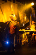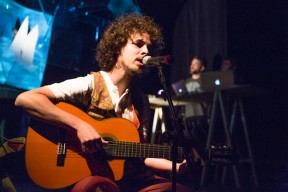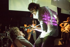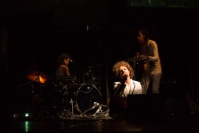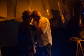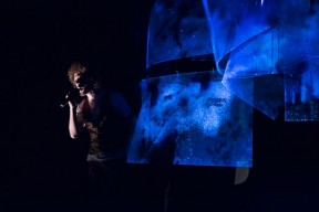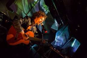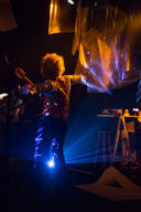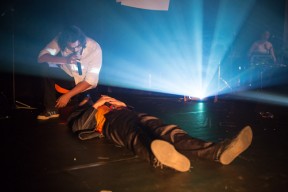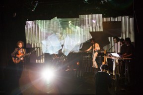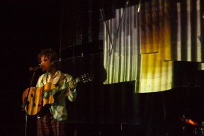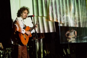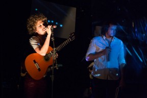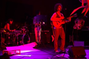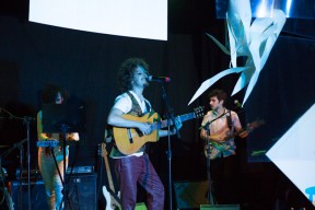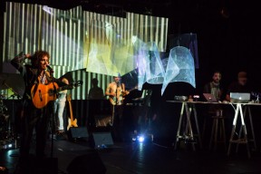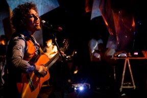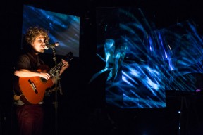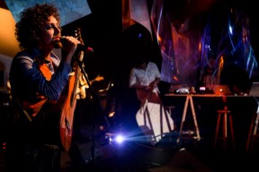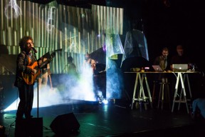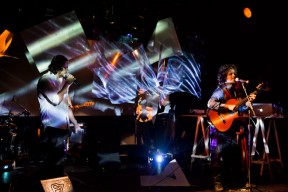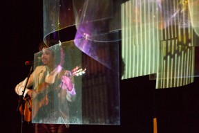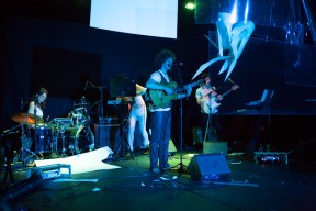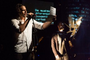 Leo, Paulo e Omar não se conheciam. Enviei o trabalho de um para o outro e eles toparam criar um espetáculo juntos. Leo e Omar inauguraram a primeira parceria: “Leveleveleve” e “Valeria a pena tudo” (poema de Omar musicado por Leo). Em termos de narrativa, o espetáculo abria com um diálogo entre dois personagens apresentado em forma de legenda, sincronizada em um vídeo feito da janela de um avião. Trabalhamos com o conceito de “não-lugar”, ou seja, lugares transitórios por onde as pessoas apenas passam mas não permanecem, como aeroportos, metrôs, escadas rolantes. A cenografia foi composta por vídeos criados pelo Paulo e Omar, com 3 projetores, sendo dois deles instalados dentro do palco. As superfícies para projeção eram compostas por placas de papel e folhas de acetato que eram manipuladas durante o espetáculo, transformando-se em móbiles e provocando diferentes efeitos de luz a partir da incidência da projeção. Esta edição marcou a primeira participação do VJ Notívago no projeto, que veio a colaborar em todas as demais edições, figura ponte firme fundamental na criação dos espetáculos. (por Marcio Debellian)